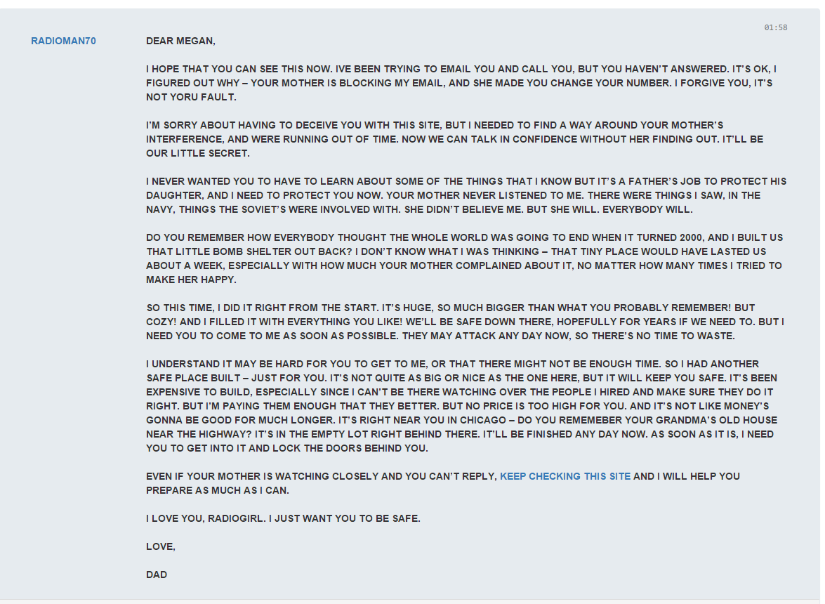 We then noticed an anagram with the missing letters in one picture that would spell out Megan. We know that mint ice cream in a bowl was her favorite, that she liked magazines, and that her favorite film was Pretty In Pink. When you click on that still it prompts you for a password which is a quote from the film, “Do you want to talk?”. This then brings you to a series of messages Howard writes to Megan warning her of the attacks that are coming. Some of the juiciest stuff we learn is that he’s near New Orleans while his wife and daughter have moved away from him to Chicago.